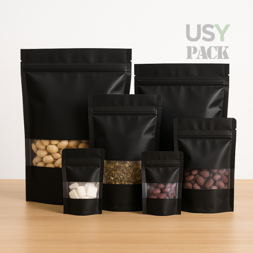 Kit Saco Saquinho Stand Up Pouch C/ Visor Zip Preto Laminado Brilho C/25 Unid P/ Alimento Hermético