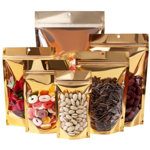 Saco Stand Up Pouch Zip Dourado Brilhante Hermético Impermeável C/ Visor Transparente com 50 unidades