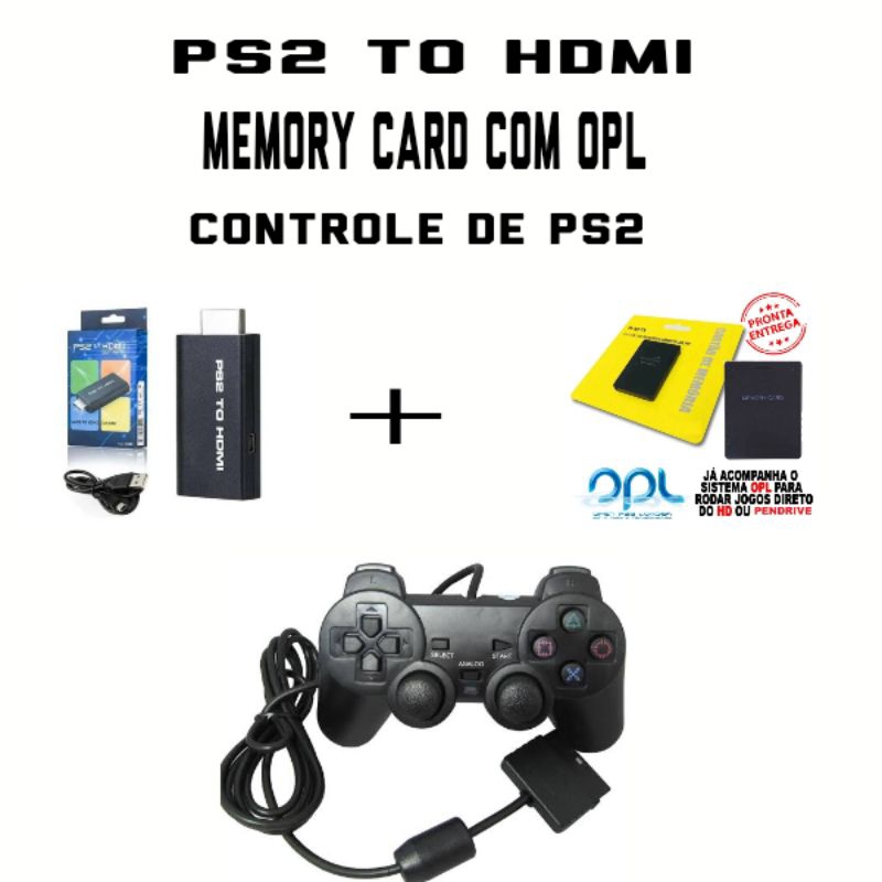 Combo Kit para Playstation 2 Cabo adaptador PS2 to HDMI + memory card com Opl instalado+ Controle play 2 com fio+adesivo