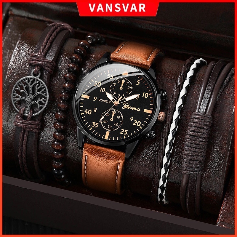 Relógios Masculinos De Genebra Faixa De Quartzo Casual De Couro Com Pulseira Vintage 4PCS