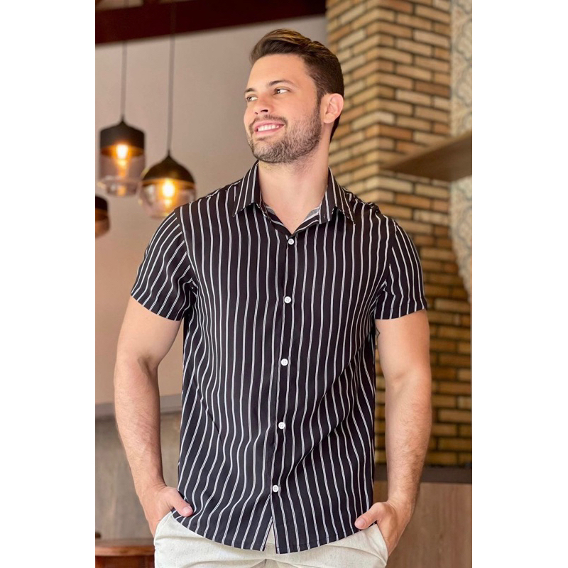 camisa masculina listra de viscose manga curta de botão camisa listrada