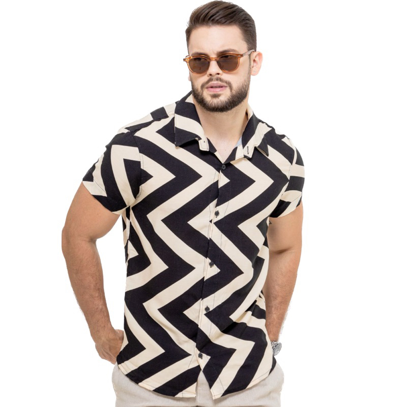 Camisa listrada masculina Zig Zag em VISCOLINHO manga curta de botão