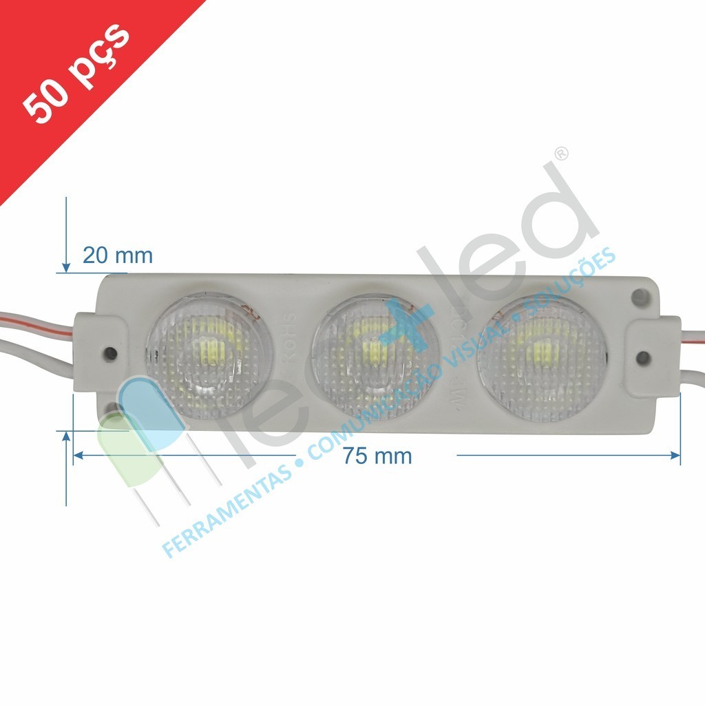 50 Módulo Mega Lente 3 LED Lateral Branco Frio 3W