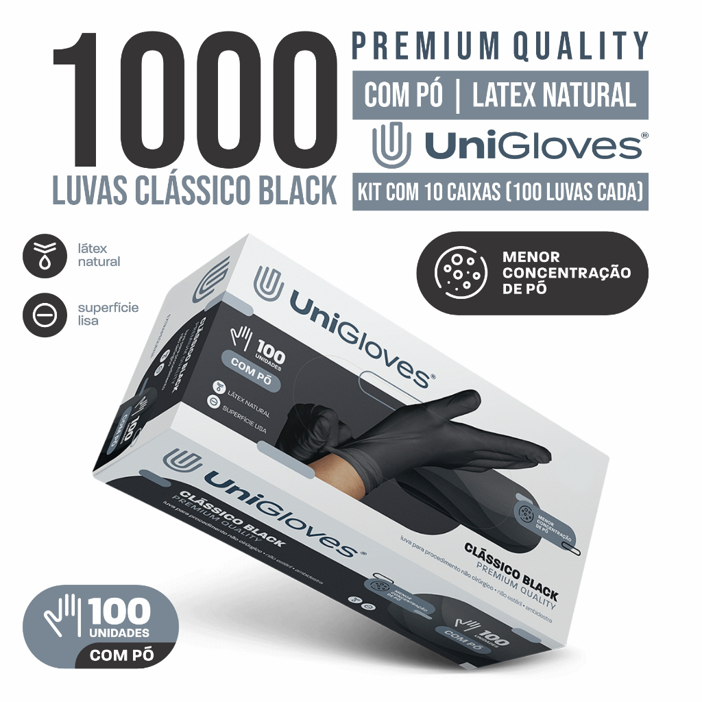 Kit com 10 caixas de Luvas Descartáveis Unigloves clássico PRETA c/100 Unidades COM PÓ