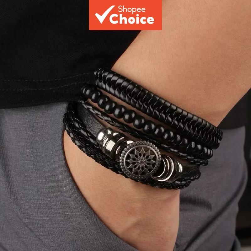 Conjunto De Pulseira De Couro PU Preto 4 Peças Moda Masculina Ajustável Joia Presente