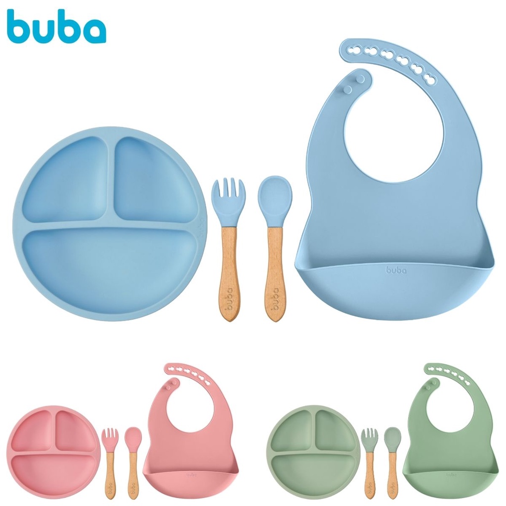 Kit Refeição Infantil 3 Peças Prato com Divisórias e Ventosas, Kit Talher Garfo e Colher Silicone Cabo Bambu e Babador Pega Migalhas Silicone Buba