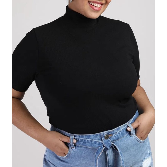 Blusa Plus Size Manga Curta Visco Lycra Premium com Detalhe na Gola de 2 Fibela Tubo