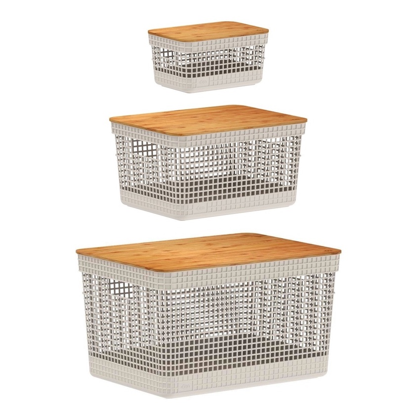 Kit 3 Cesto Organizador Grid C/ Tampa De Bambu 2,5 E 8 E 20l