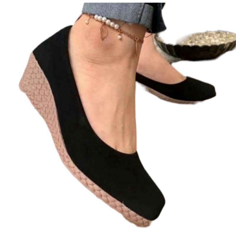 SANDÁLIA FEMININA DE NAPA PREMIUM PRETA OU JEANS AZUL ANABELA SALTO PLATAFORMA TIPO PEEP TOE REVESTIDO EM CORTIÇA DE ALTA QUALIDADE | PROMOÇÃO | VERSÁTIL | CLÁSSICA | MODERNA | CASUAL E FORMAL | SAPATO DA MODA TENDÊNCIAS