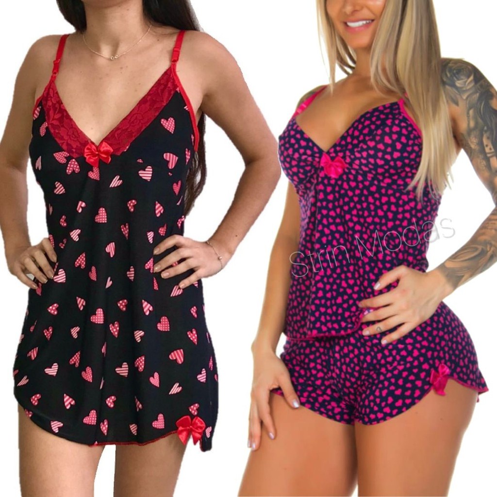 Kit 2 Camisola Feminina com Calcinha Fio/Short Doll Baby Dol Pijama Sexy Sensual Noite Casual