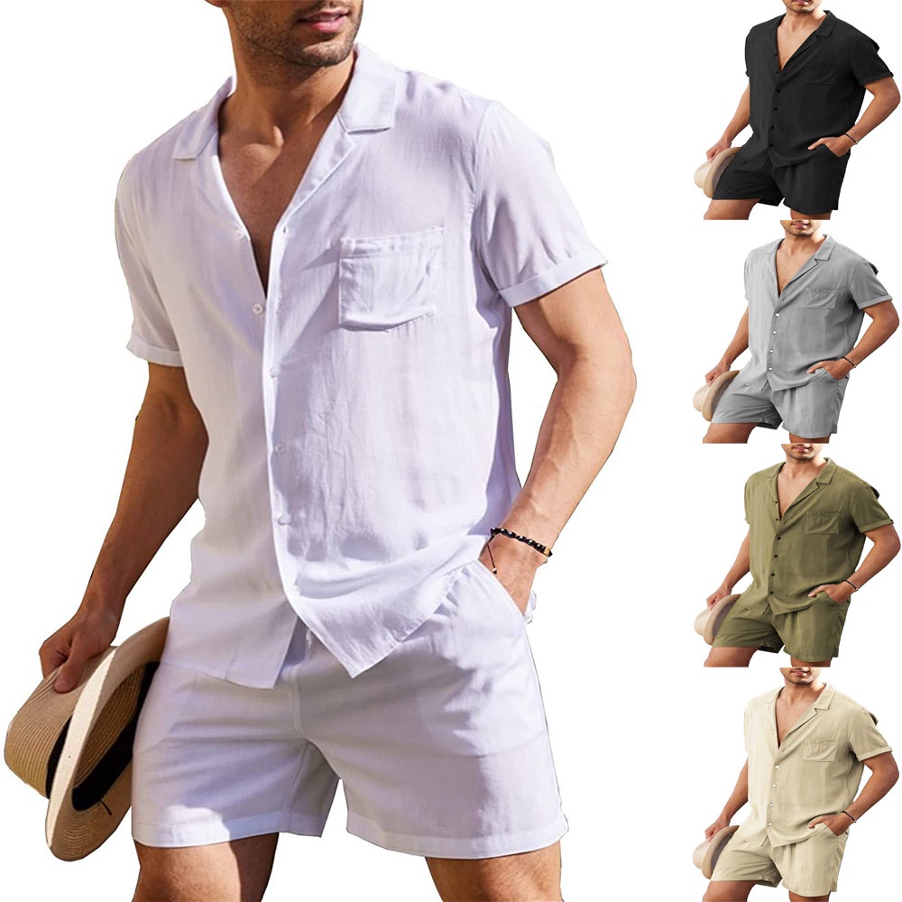 Conjunto Masculina De Algodão/Linho Camisa E Shorts Cor Lisa 2 Peças Roupas Casual Feriado Praia
