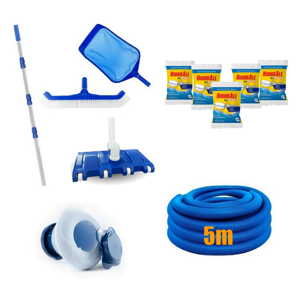 KIT LIMPEZA E MANUTENÇÃO DE PISCINAS COM 5 PASTILHAS HCL 200G - MANGUEIRA 5 A 8 METROS - CABO 1,60M