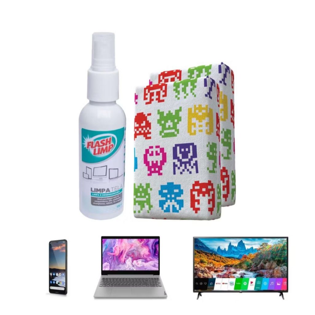 KIT LIMPA TELAS FLASH LIMP COM 2 ESPONJAS DE MICROFIBRA E 1 SPRAY - LIMPA CELULAR, TV, NOTEBOOK, MONITOR