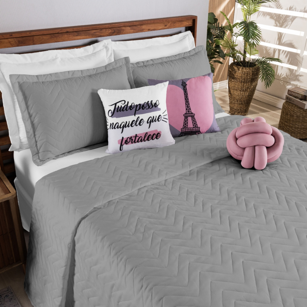 Kit Cobre Leito Colcha Queen e Casal Padrão 8 Peças ou Solteiro 5 Peças Isabela Almofada Bordada Love e Almofada de Nó - Sucesso Decorativo
