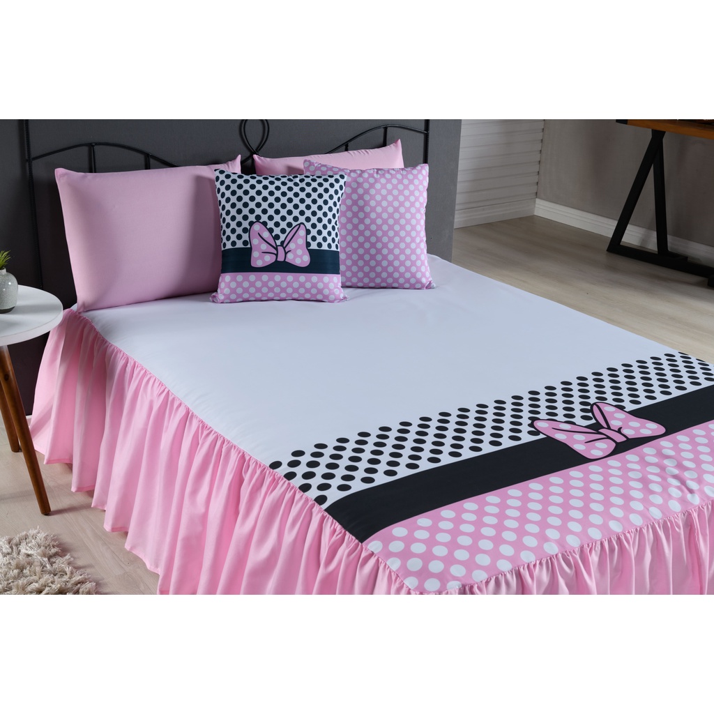 Kit Colcha Cobre Leito Casal Padrão Queen Estampa Personagem Minnie Rosa 05 Peças