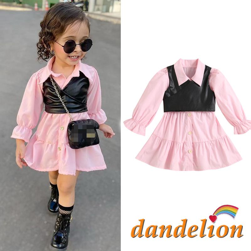 Conjunto Infantil Feminino Vestido Manga Longa Lapela + Colete De Couro Pu Preto Dandelion