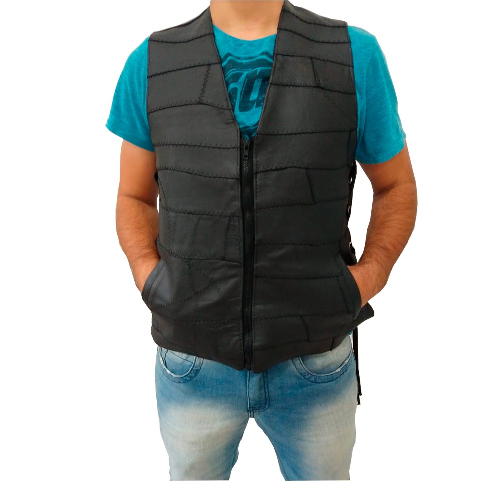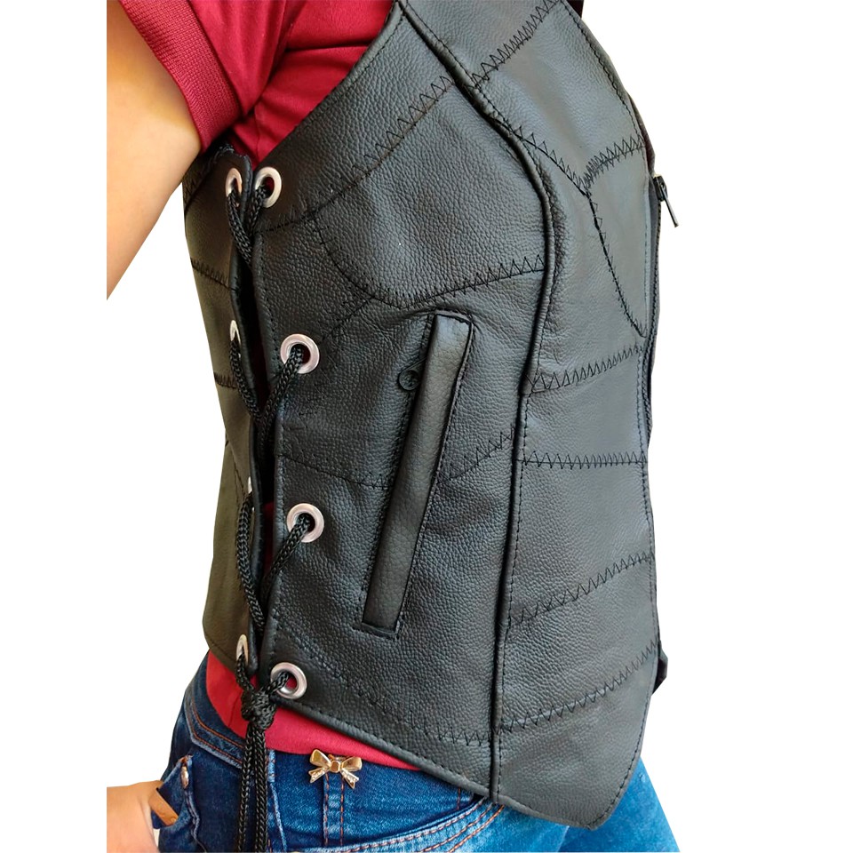 Colete Motociclista Feminino de Retalho de Couro com Regulagem Lateral.