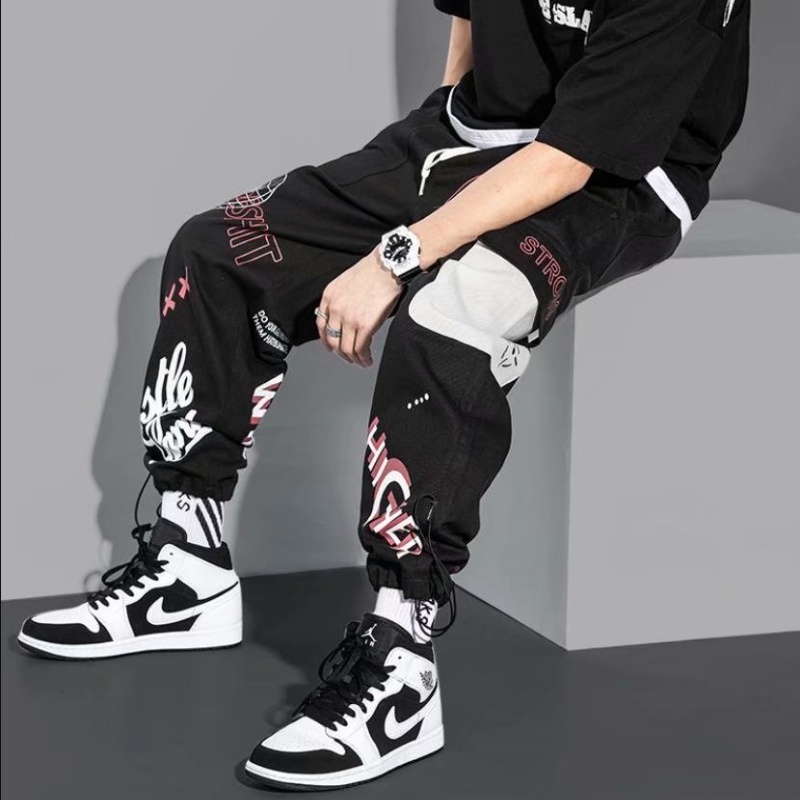 Calças Da Carga Dos Homens Rasgado Hip Hop Preto Fita Streetwear Harem Pants Jogger Sweatpants 2023