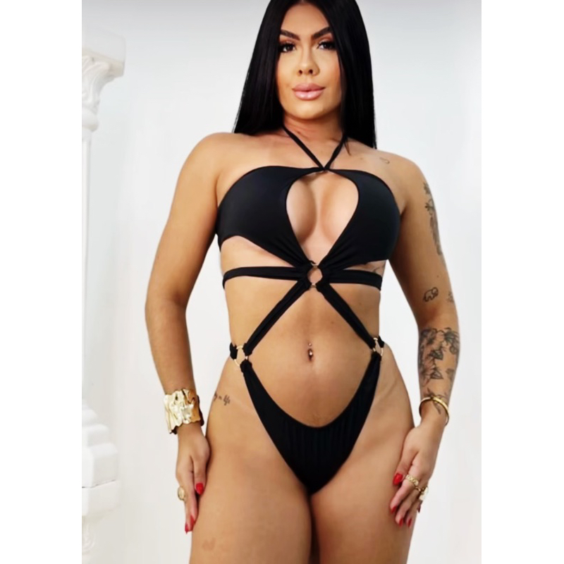 Body/maiô cavado com decote, sexy e argolas, preto e branco no verão 2023 sexy com bojo fio dental e amarrações
