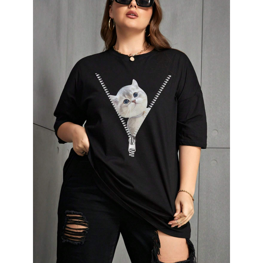 Camiseta Oversized Ziper Gato Estampa Gatinho Fofo Life Style Manga Curta Ombro Caido Aesthetic Feminino Plus Size