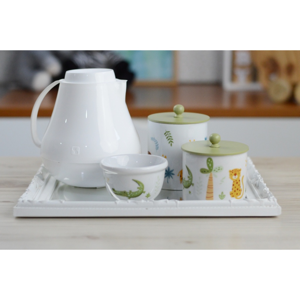 Kit Higiene Bebê Porcelana Branco Gelo Bandeja Para 4 Peças Potes Mini Garrafa Térmica