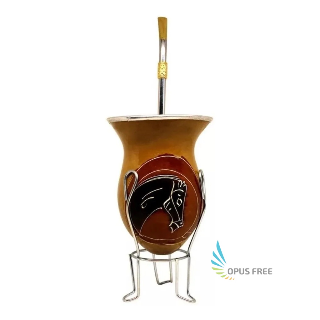 Kit Cuia para Chimarrão Tradicional com Tripé + Bomba + Filtro - Porongo Natural Desenho Cavalo ou Paisagem