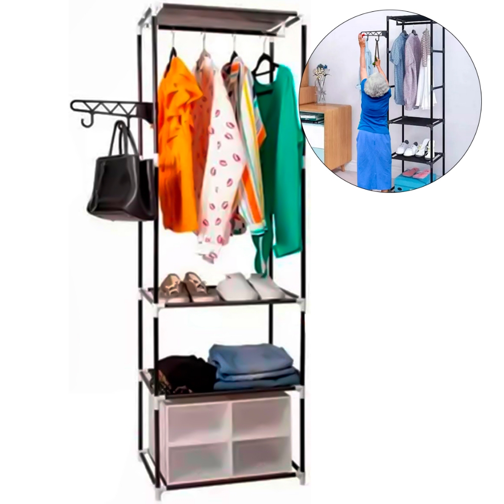 Arara Cabideiro De Roupas Com Sapateira E 2 Prateleiras E Baú Para Organização Preto/Branco