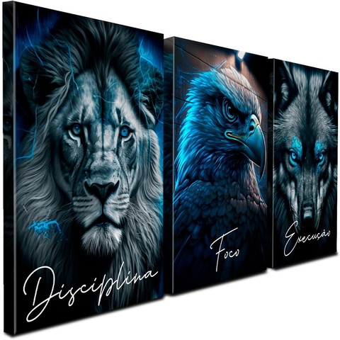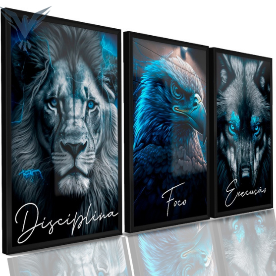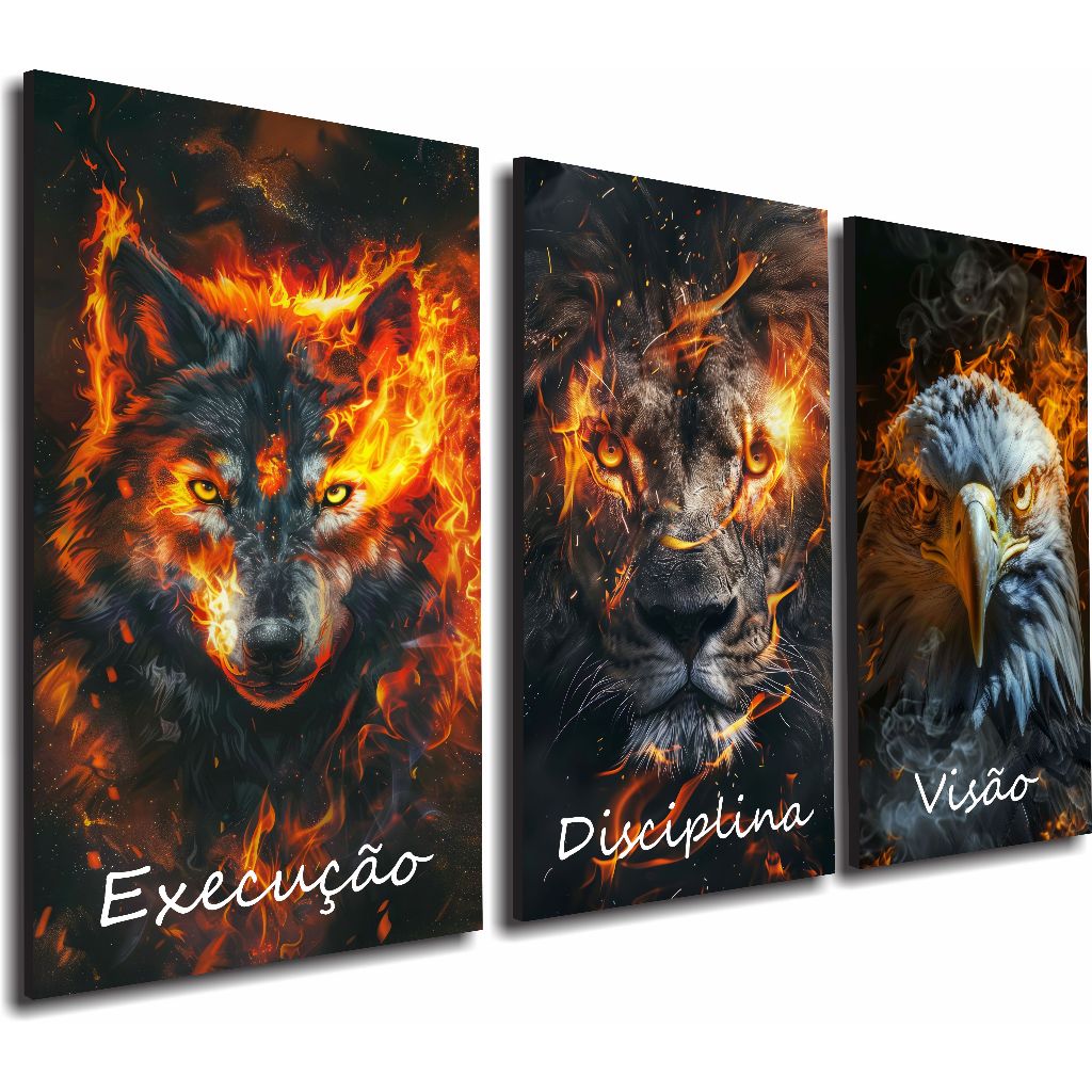 Kit 3 Quadros Decorativos Motivacionais Disciplina Leão Execução Lobo Visão Águia Sala Empresa Escritório Tamanho Gg Exclusivo Lançamento