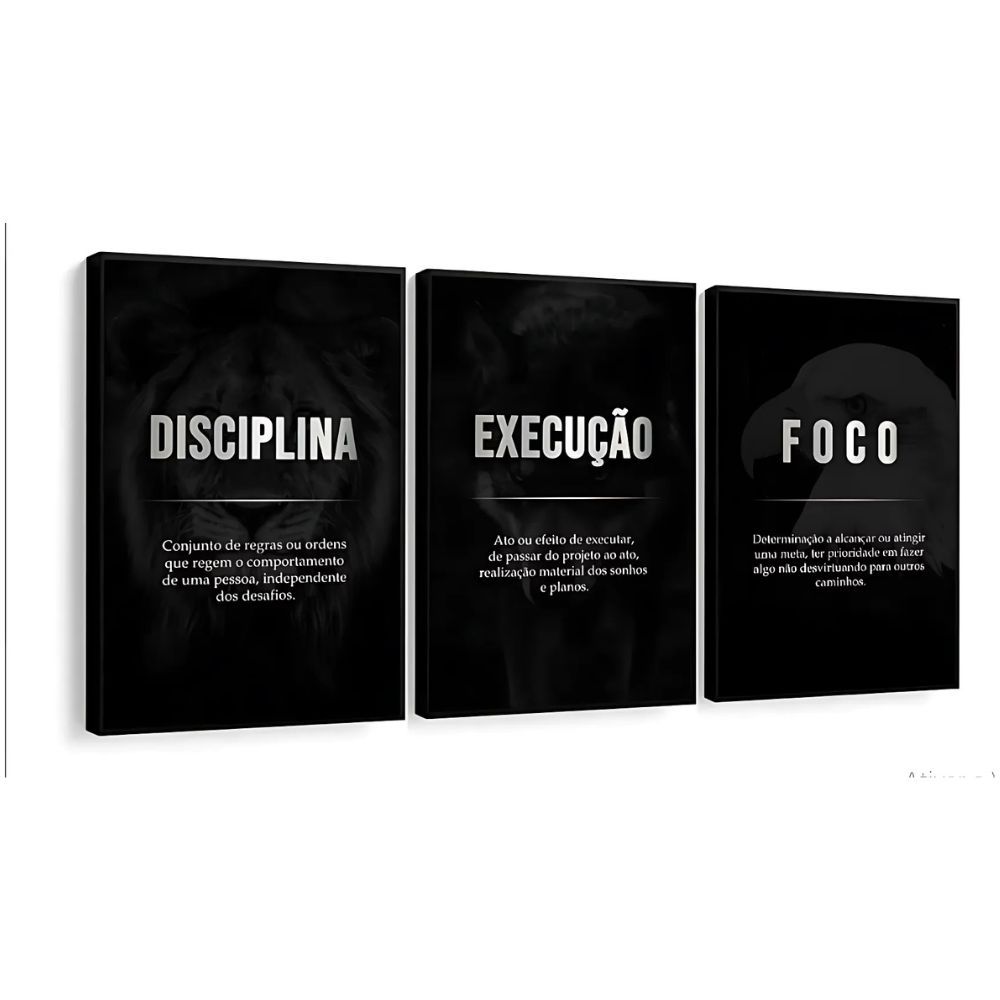 kIT 03 Quadros Decorativos Frases Motivacionais Disciplina Execução Foco Leão Águia Lobo