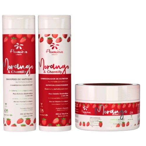 KIT SHAMPOO CONDICIONADOR E MASCARA MORANGO E CHANTILLY PARA CABELOS QUEBRADIÇOS E SEM VIDA