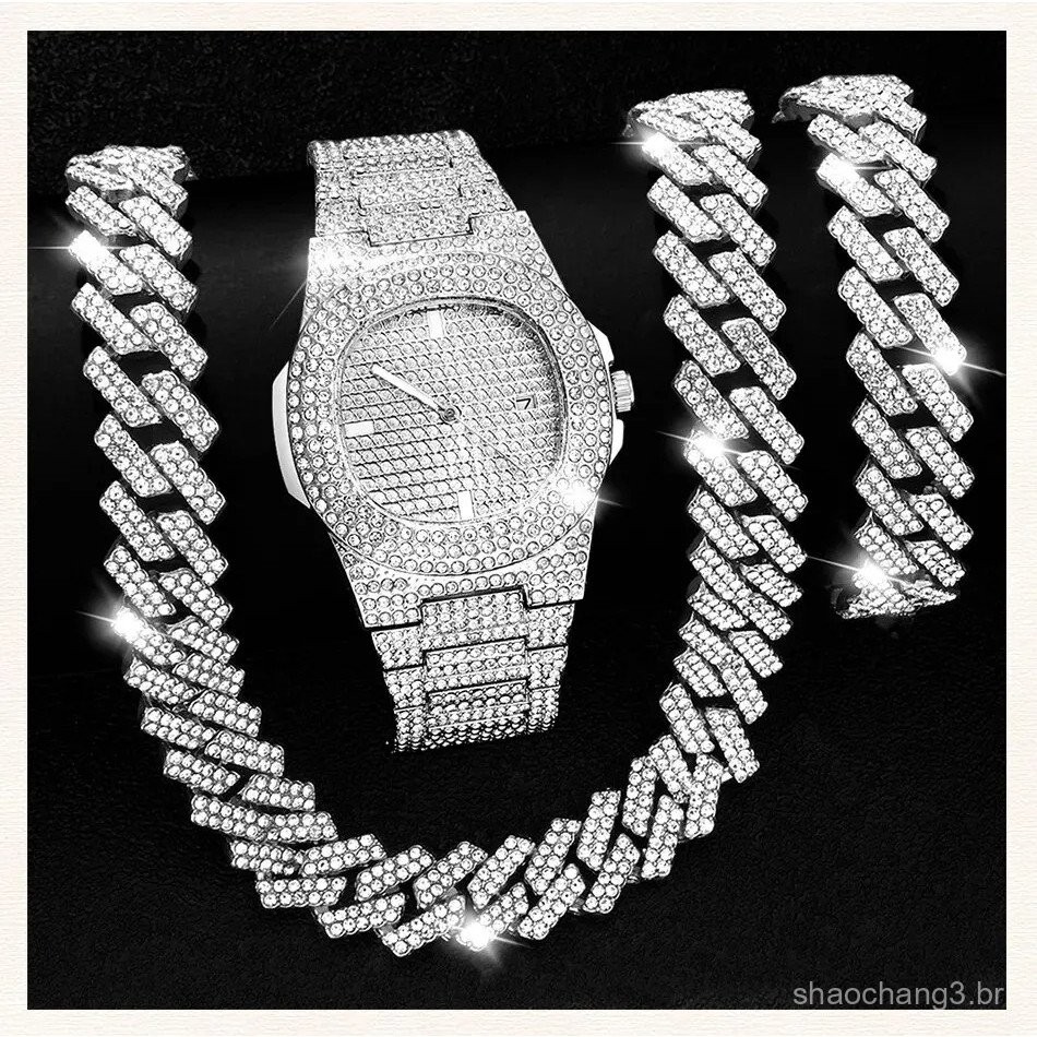 Relógios De Moda Rhinestone Masculinos Cuba Hip Hop Colar De Diamante Pulseira