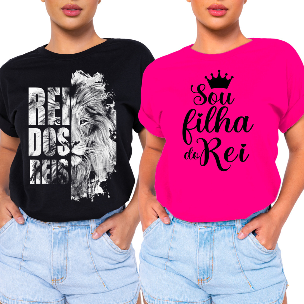 Kit 2 T-shirt Feminina - Leão REI DOS REIS, SOU FILHA - Camiseta - Blusinha - Frases Cristã - 100% Poliester
