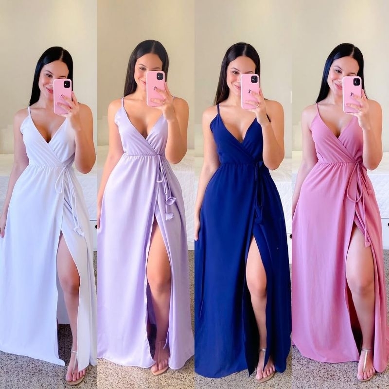 Vestido Liso Longo Com Duas Alça Botoes Laterais Fenda e Costa de Elastec