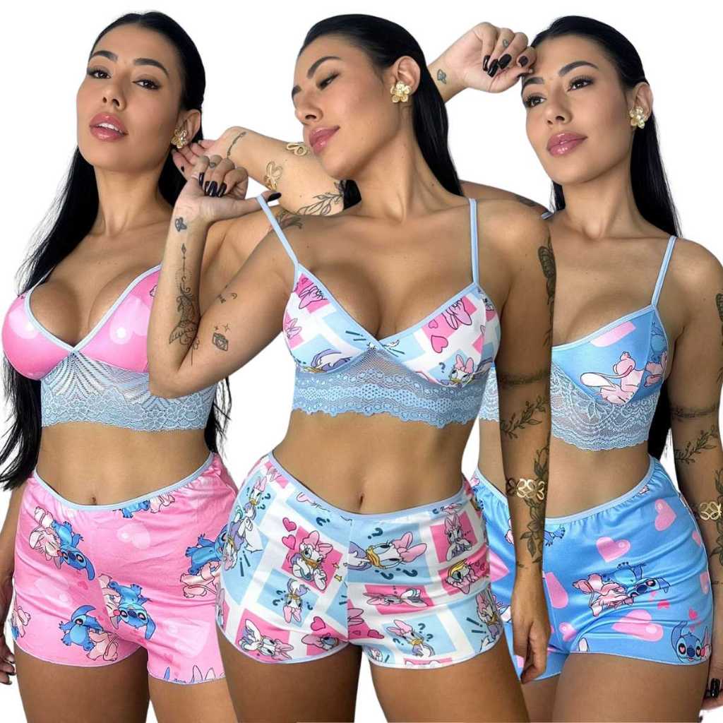 Kit 3 Conjunto Short Doll Curto Pijama de Dormir Estampado Feminino Personagem Sem Bojo com Alça Cropped