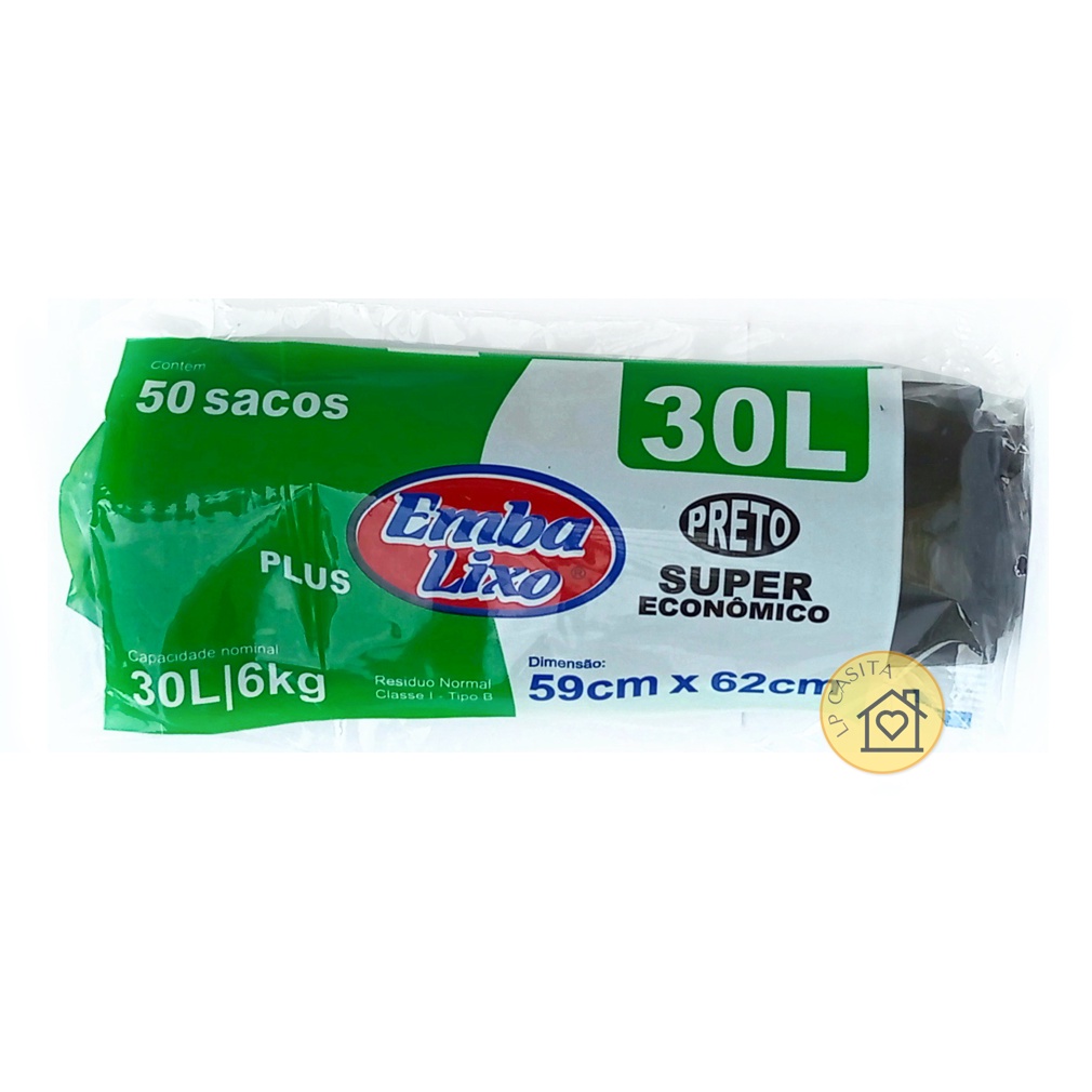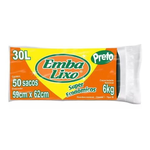 Saco de Lixo 30L Super Econômico 59x62cm EmbaLixo 6Kg Preto Pacote 50 Unidades