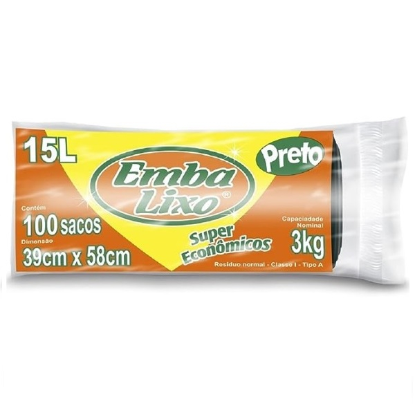 Saco de Lixo 15L Super Econômico 39x58cm EmbaLixo 3Kg Preto Pacote 100 Unidades