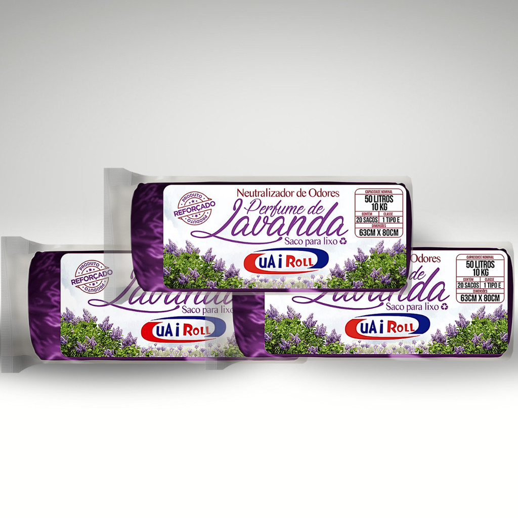 Saco De Lixo Kit 3 Rolls 60 Unidades 50 Litros Tira Odor Perfumado Com Cheiro de Lavanda Econômico