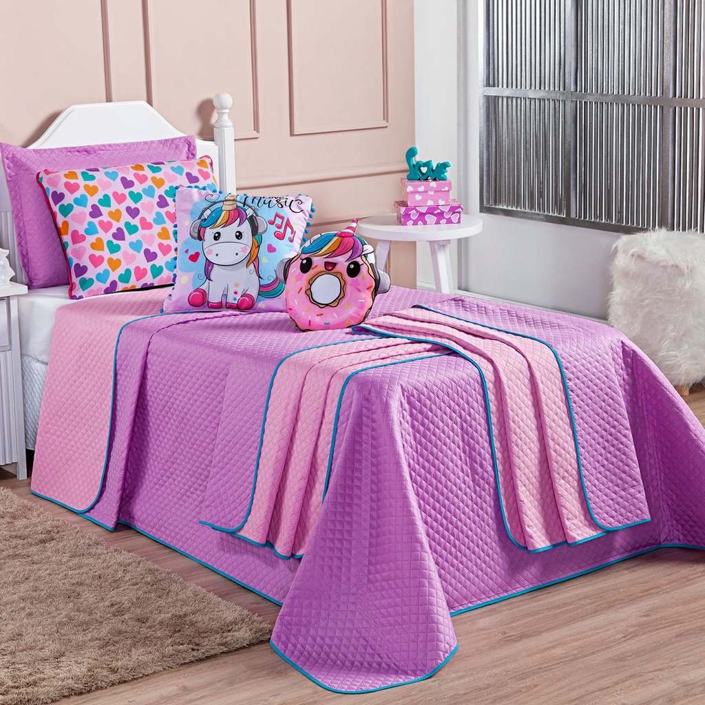 Kit Cobre Leito Donuts Unicórnio Dupla Face c/ Almofada Para decoração Solteiro 05 Peças