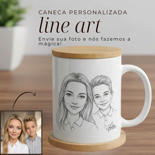 Kit Presente Caneca Personalizada Foto com Tampa e Descanso de Bambu | Estilo Line Art Minimalista