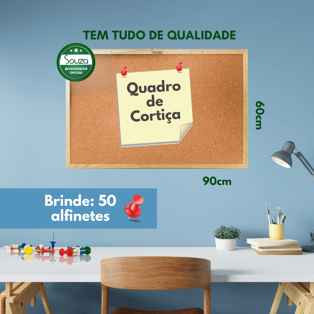 Quadro de Cortiça 90x60 com Moldura de Madeira Aviso Lembrete Anotação Estudo Inclui 50 Alfinetes