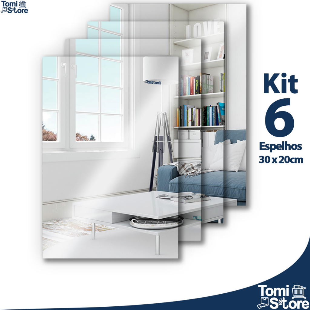 Kit 6 Espelho Placa 30x20cm Com Adesivo Auto Colante Acrílico Boa Nitidez Retangular Decorativo Quarto Sala Banheiro Espelhos 30 x 20 cm Espelhos