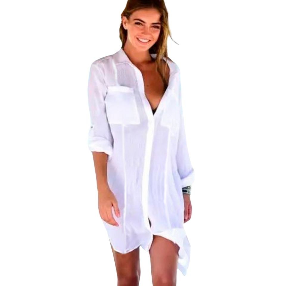 Saída De Praia Manga Longa Camisão Vestido Chemise Feminino Moda Verão