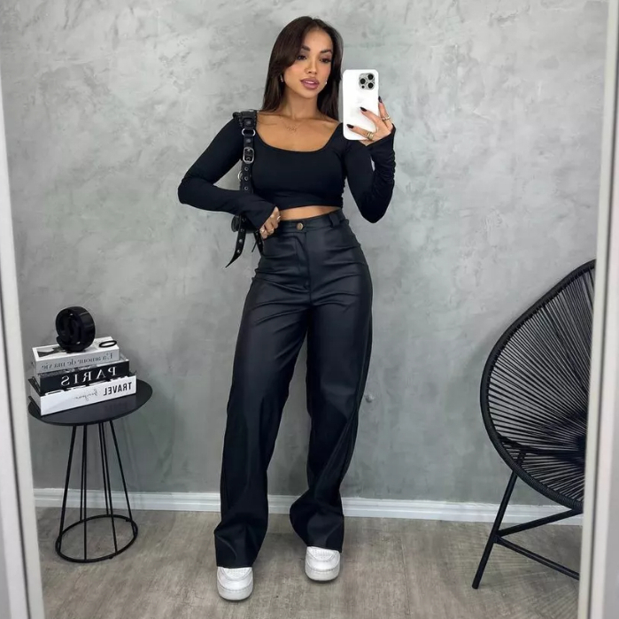 Calça Wide Leg Feminina Cintura Alta Couro Fake Preta Pantalona Retrô Moda Gringa Blogueira Balada
