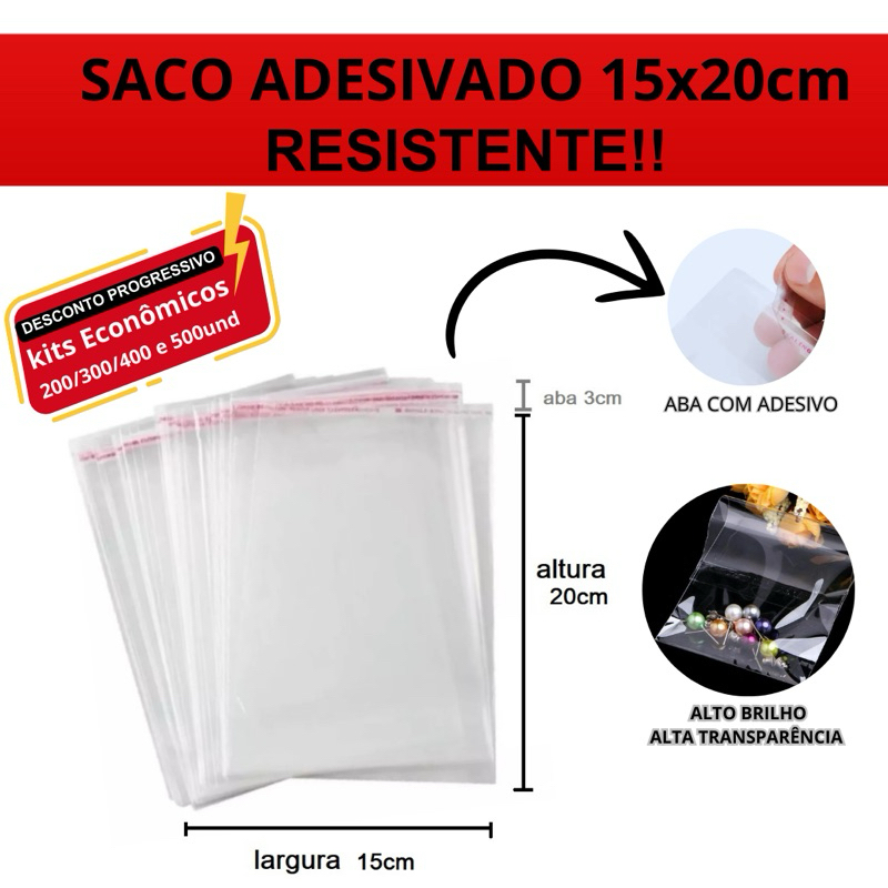Saco Plástico Adesivado transparente 15x20cm +3cm de aba - 100 a 500 und - desconto progressivo