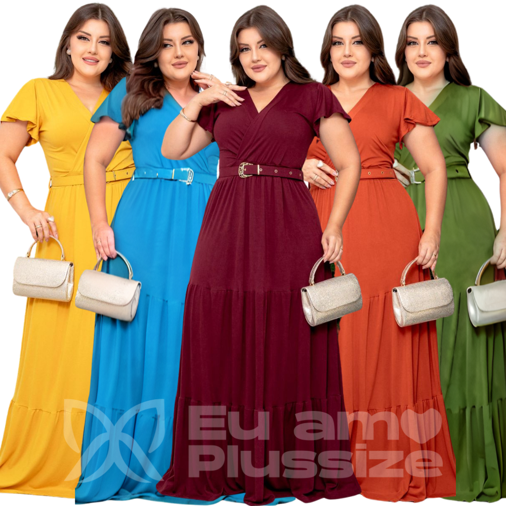 Vestido Feminino Longo Plussize Tamanho Grande Manga Flare Com Cinto Moda Evangélica Curve