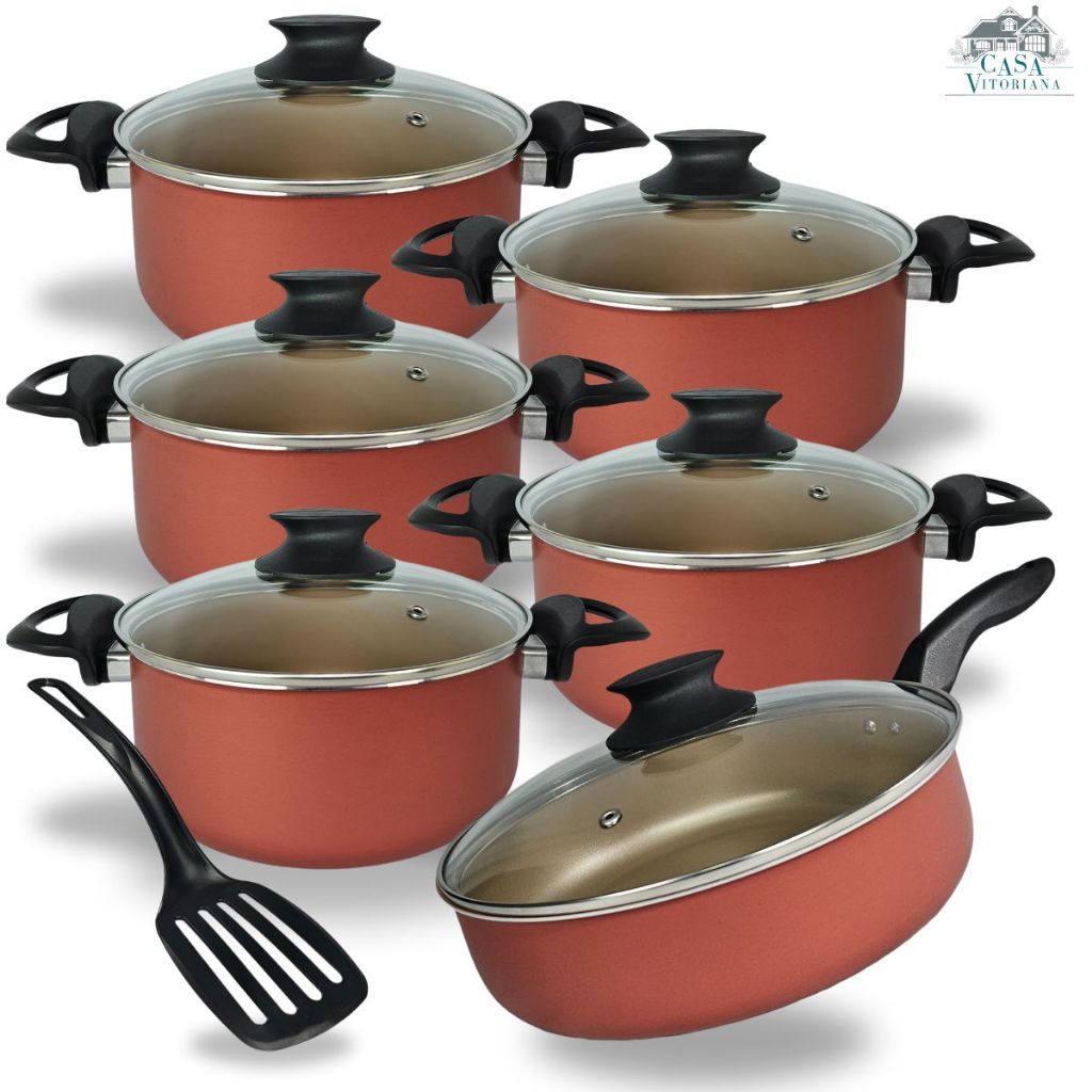 Jogo De Panelas Caçarola 16 à 24 Cereja e Dourado Antiaderente + 2 Utensílios.