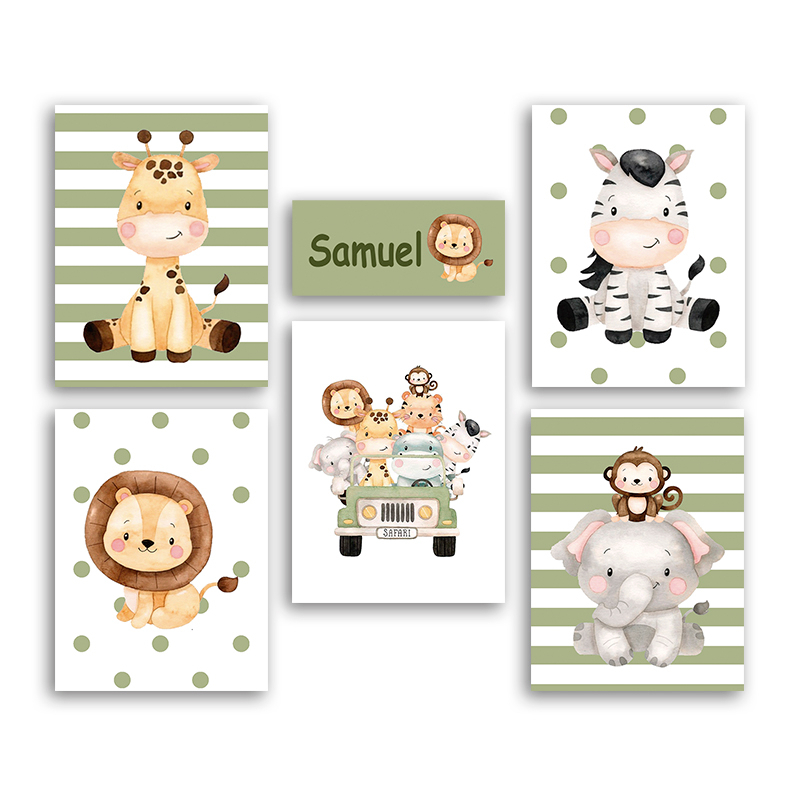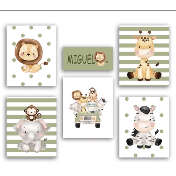 Quadros decorativos safari 6 peças com o nome do seu filho(a) para seu enxoval