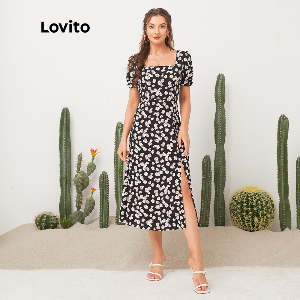 Lovito Casual Vestido de Estampa Floral de Gola Quadrada L11D32 (Preto)