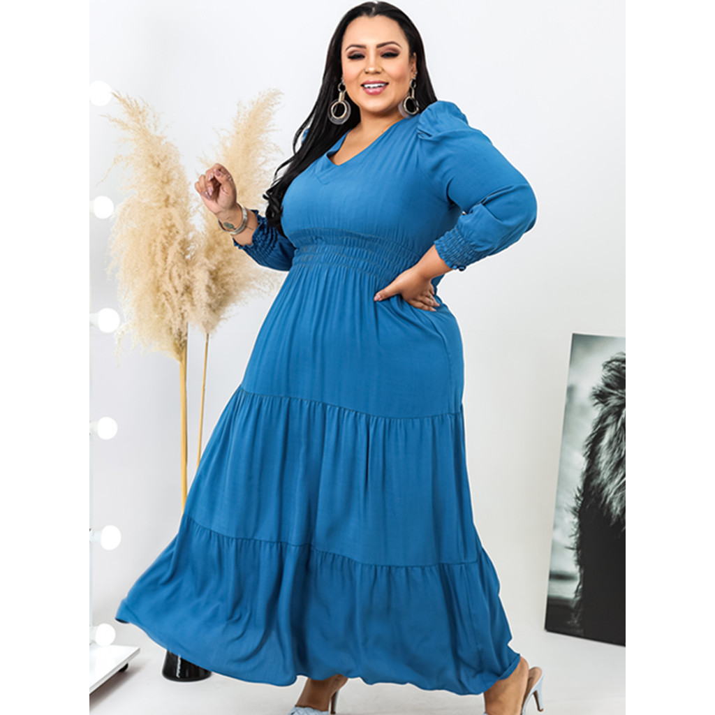 Vestido Longo Plus Size manga longa gola V Elastex Blogueira 44 Ao 50 COD/V27