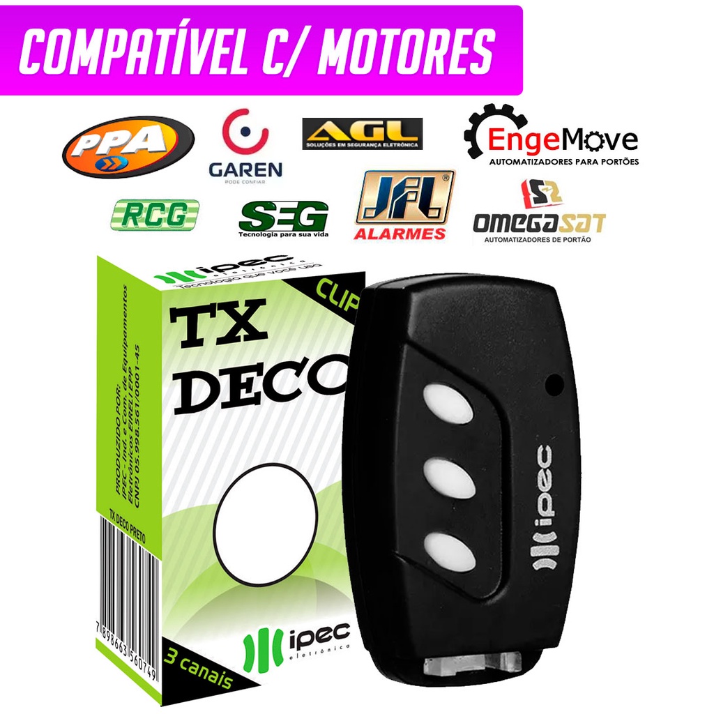 Controle Portão Eletrônico e Alarme Tx Deco 433 Mhz P/ PPA RCG GAREN SEG AGL